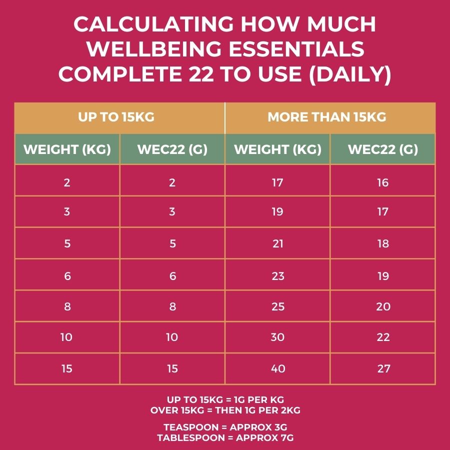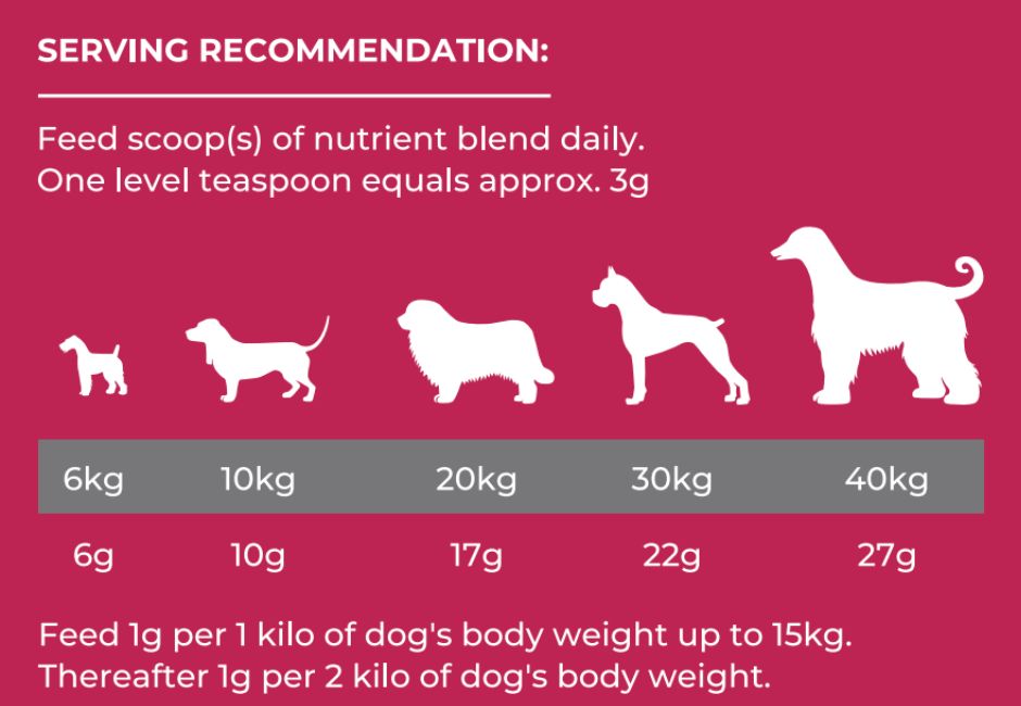 5g per 5kg of your dog’s weight up to 15 kg then 5g per 10 kg of dog’s weight.
