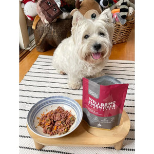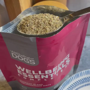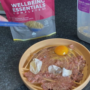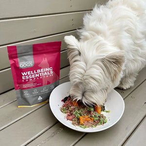 Dog sniffing homemade dog food with Wellbeing Essentials Complete 22