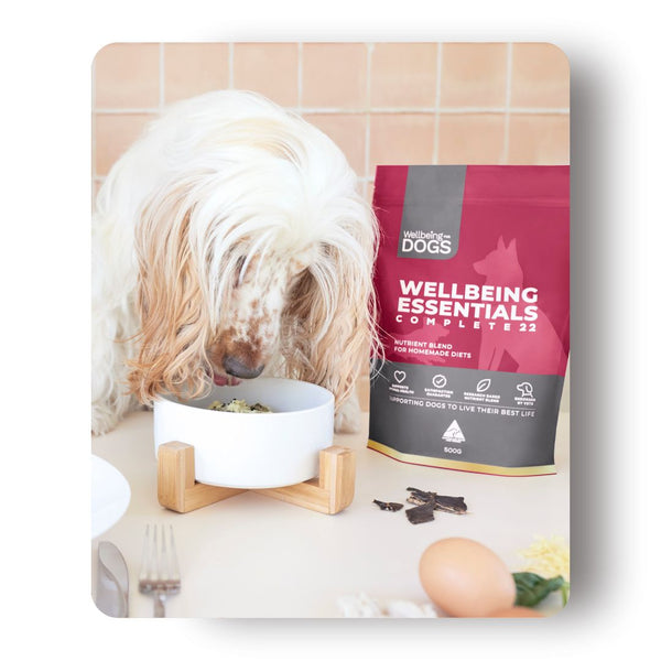 Wellbeing Essentials Complete 22 was formulated & developed in partnership with vets, created to help naturally cover the typical deficiencies in homemade food for dogs.